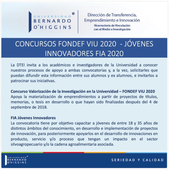 En el marco de los concursos FONDEF VIU 2020 de ANID y Jóvenes Innovadores de FIA, que están dirigidos a estudiantes universitarios, egresados y titulados, la Dirección de Transferencia, Emprendimiento e Innovación invita a los académicos e investigadores de la Universidad a conocer nuestros procesos de apoyo a ambas convocatorias y, a la vez, solicitarles que puedan difundir esta información entre sus alumnos y ex alumnos, e invitarlos a patrocinar sus iniciativas.